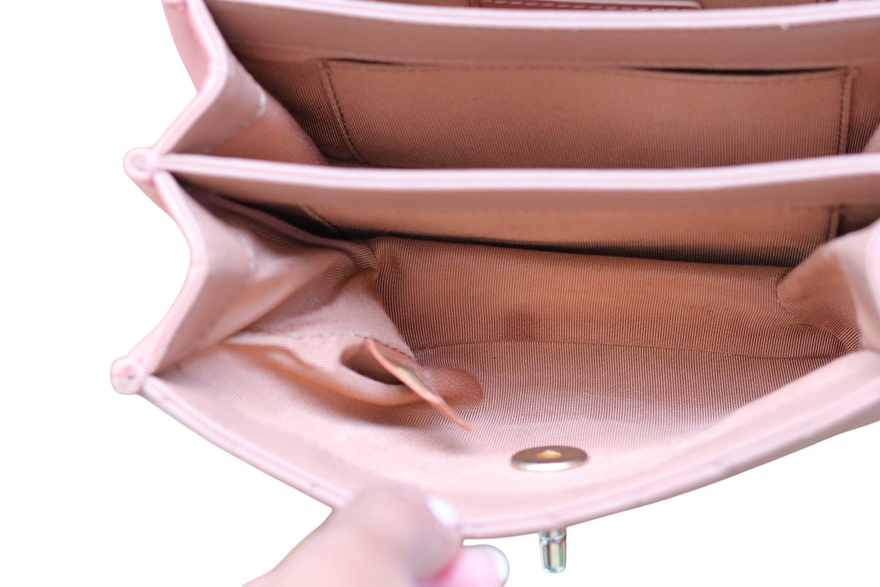 Condition: Very good. Small lEsther rubbing on the corners and discoloration on the hardware to note.