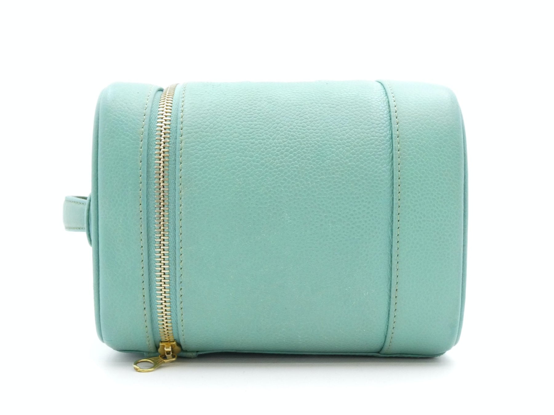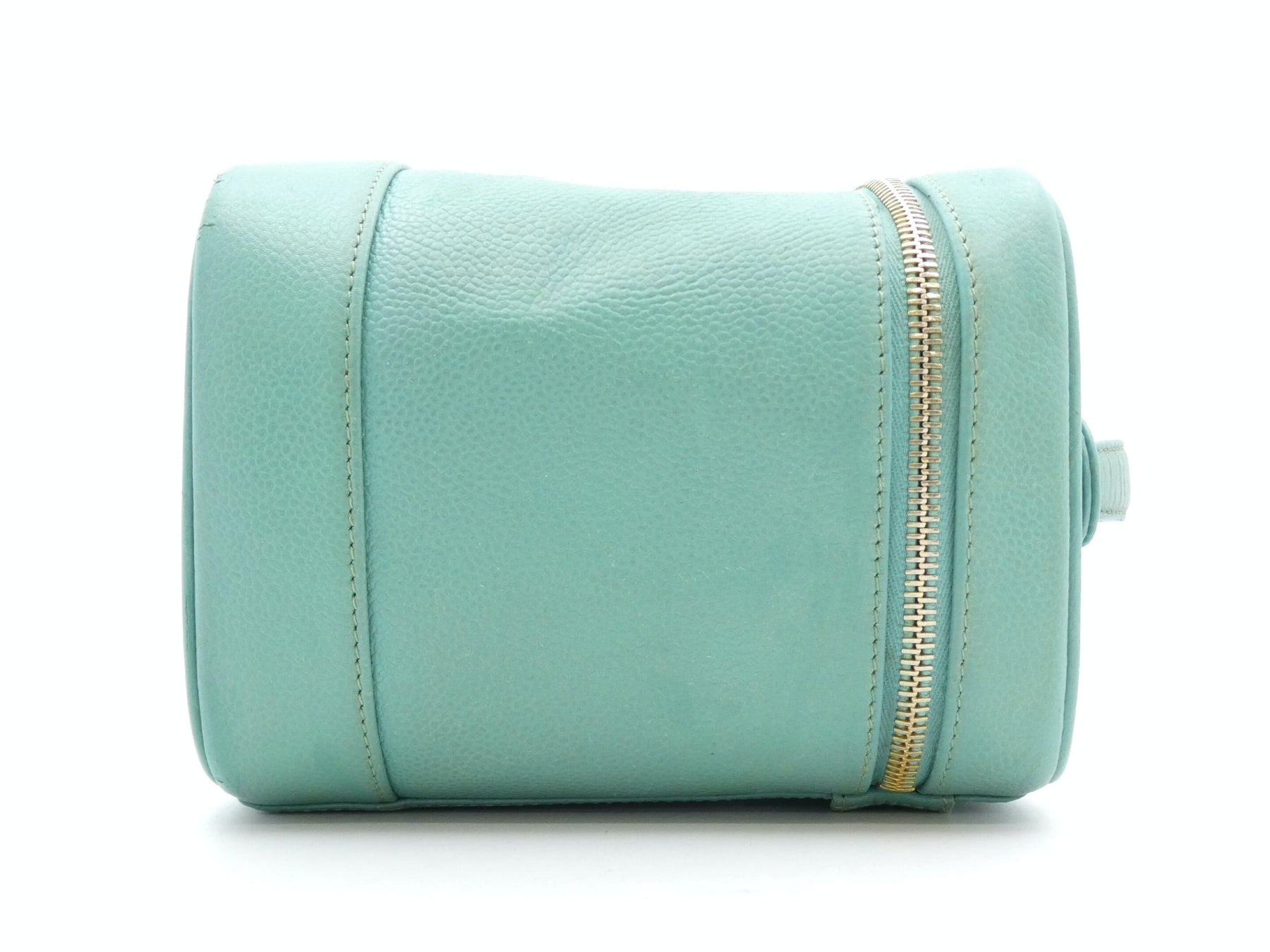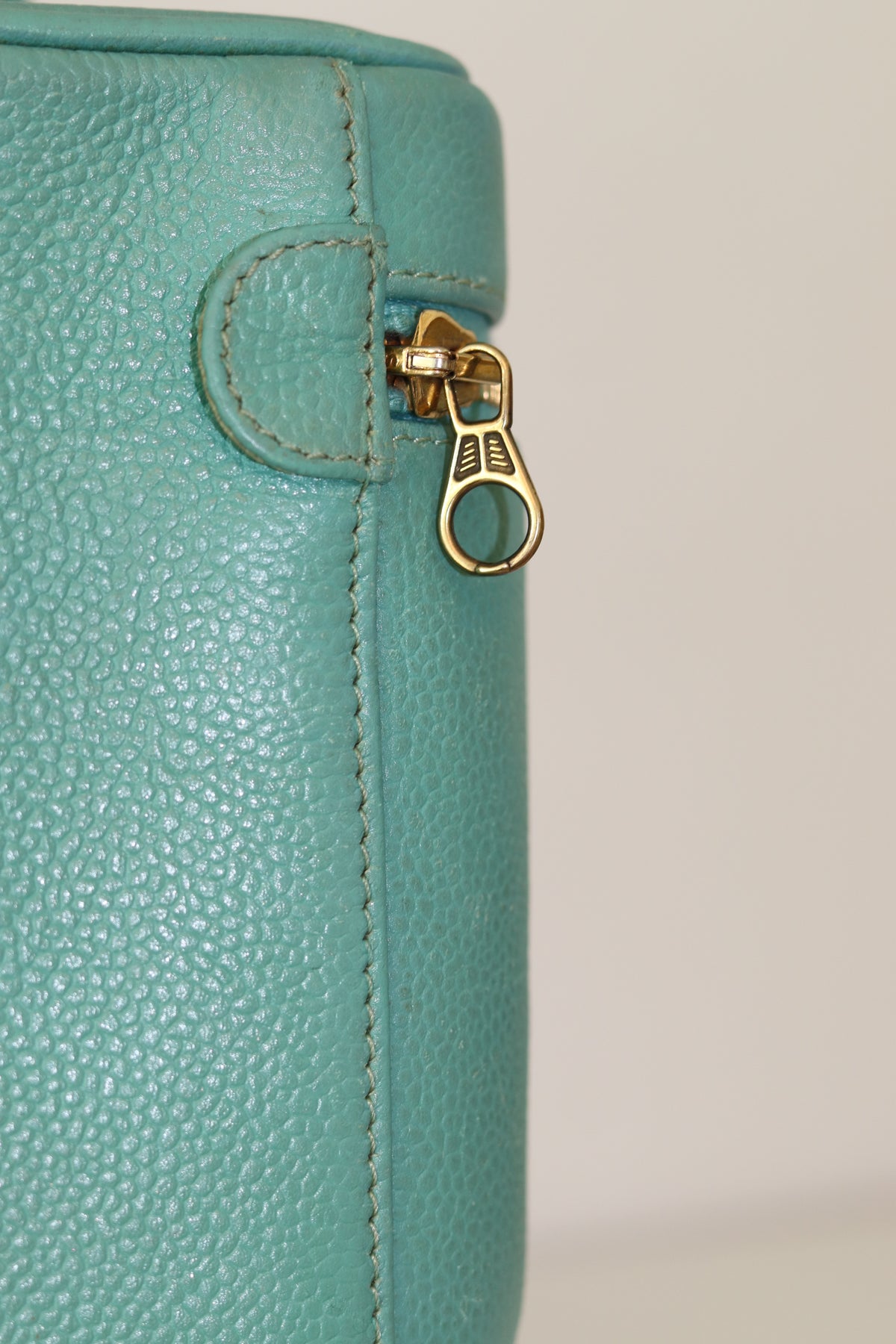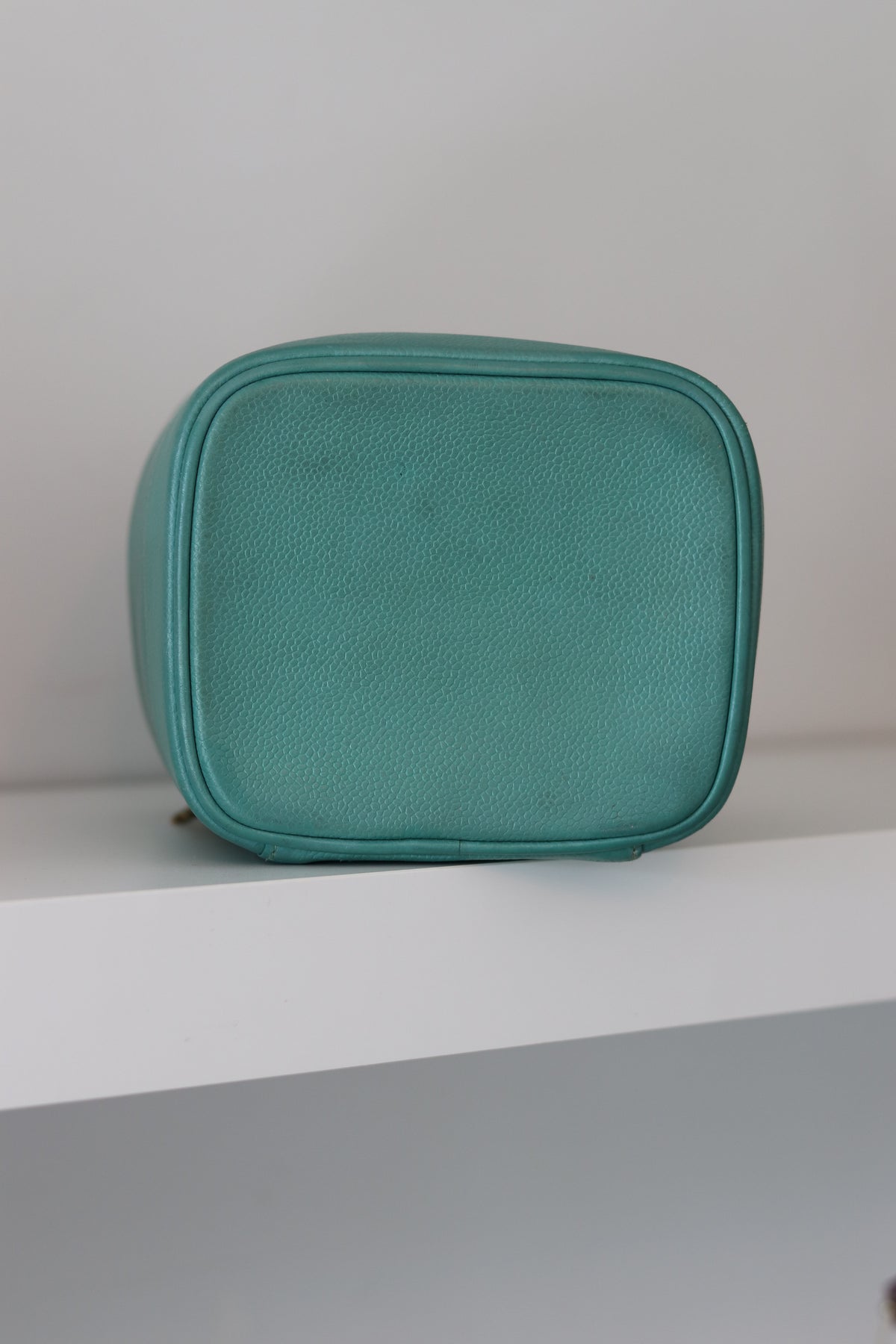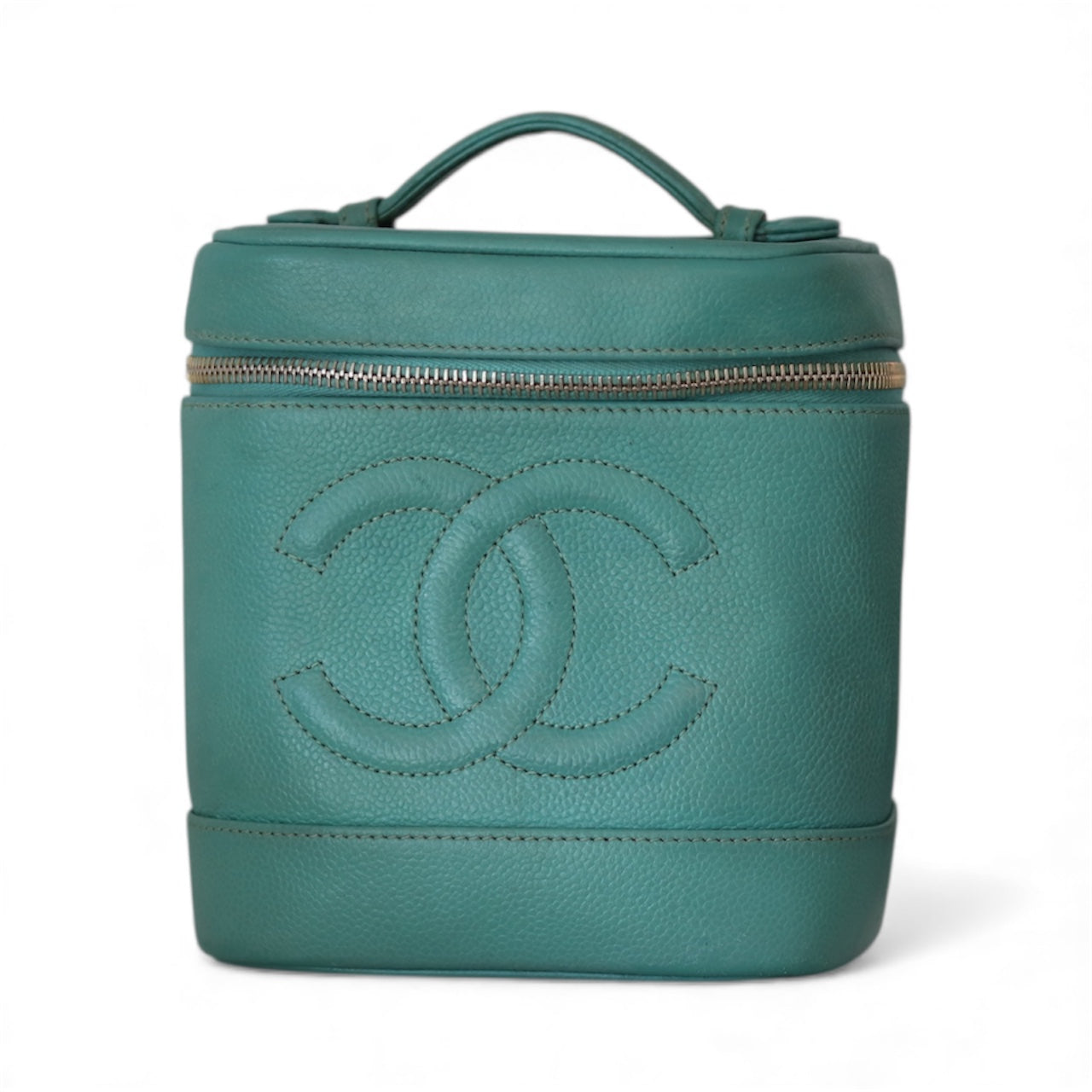A rare vintage Chanel piece, this Timeless Vanity Case is crafted in luxurious teal blue-green caviar leather and dates to circa 1998. Made in France, it features the iconic stitched interlocking CC logo, showcasing Chanel’s enduring craftsmanship.
