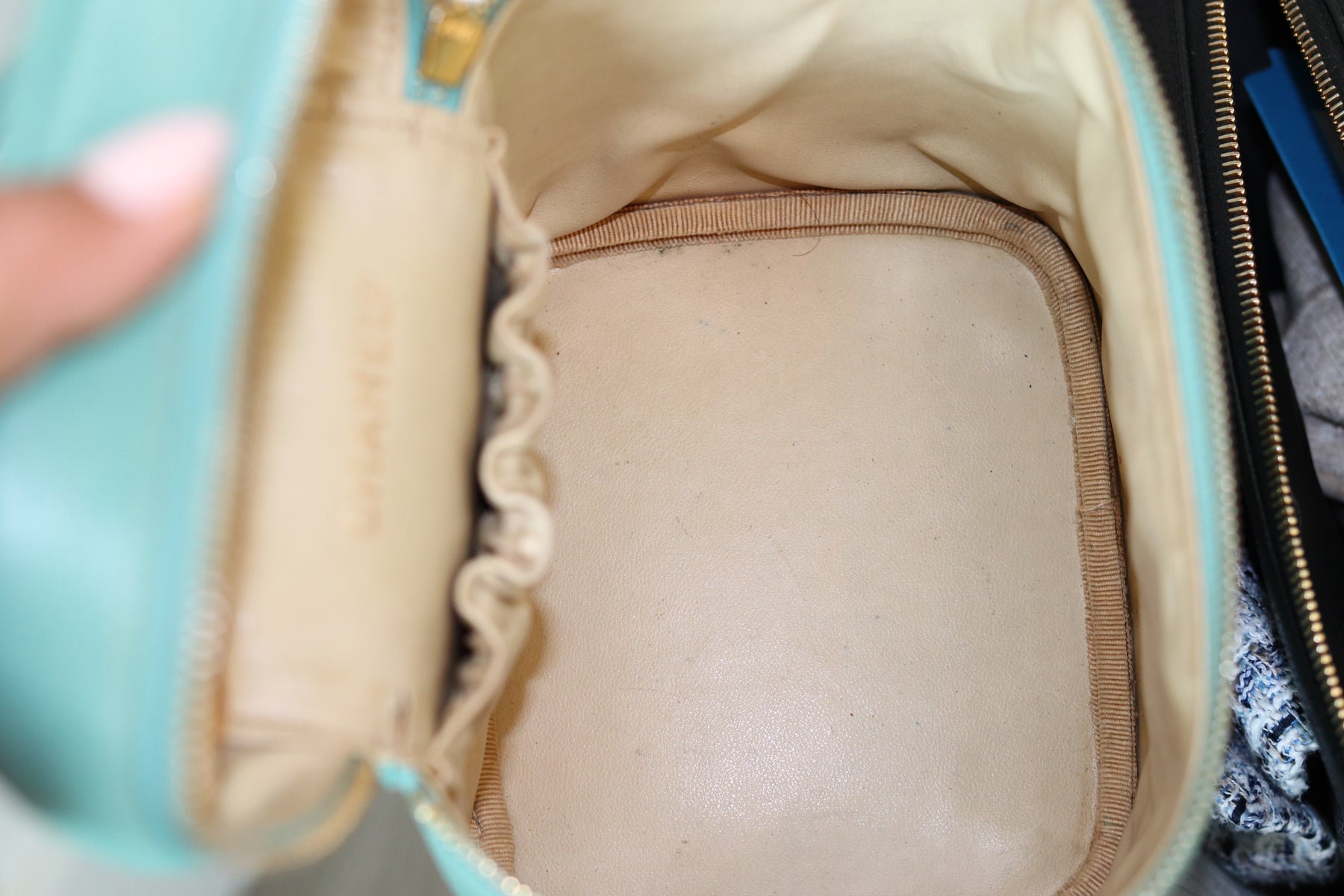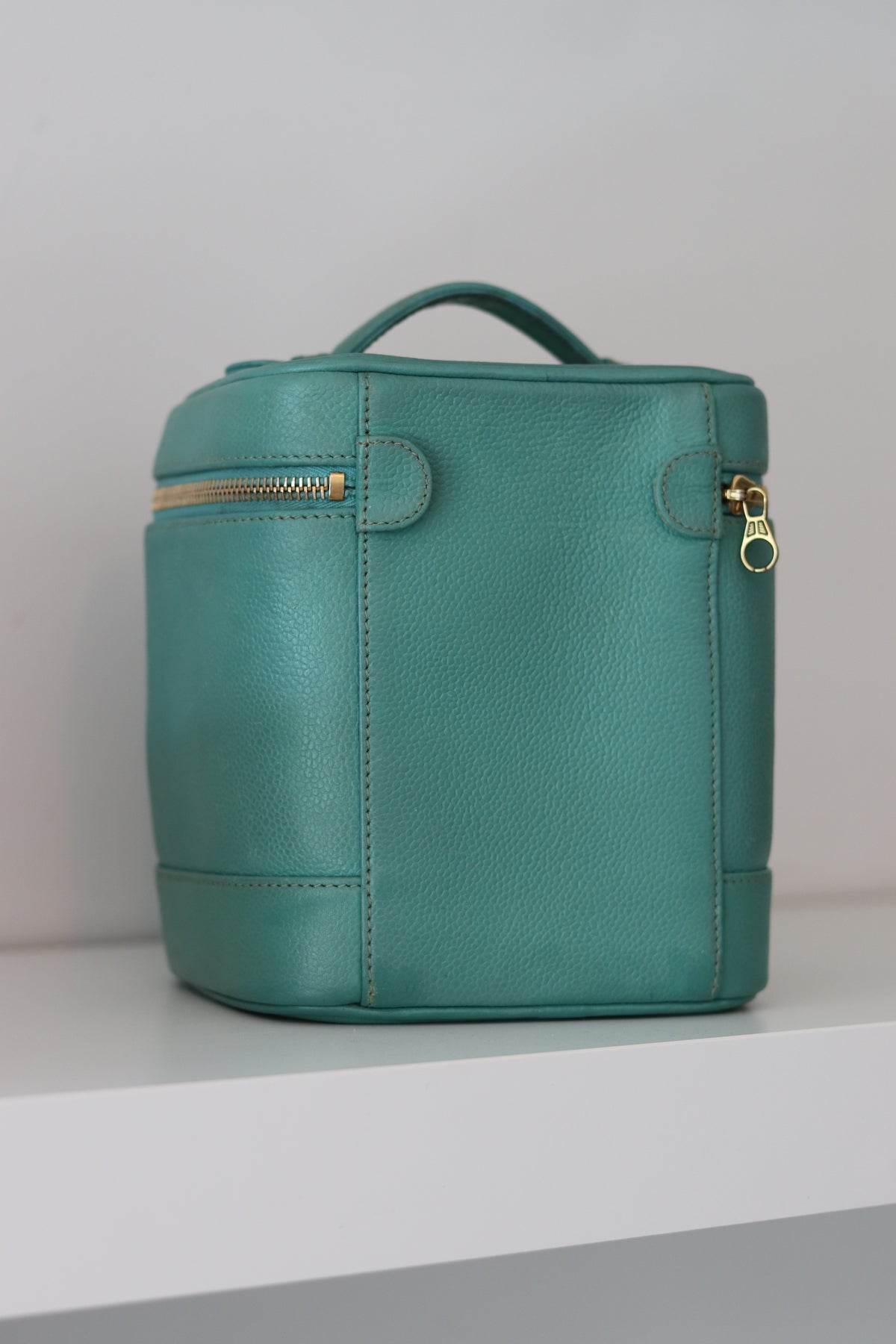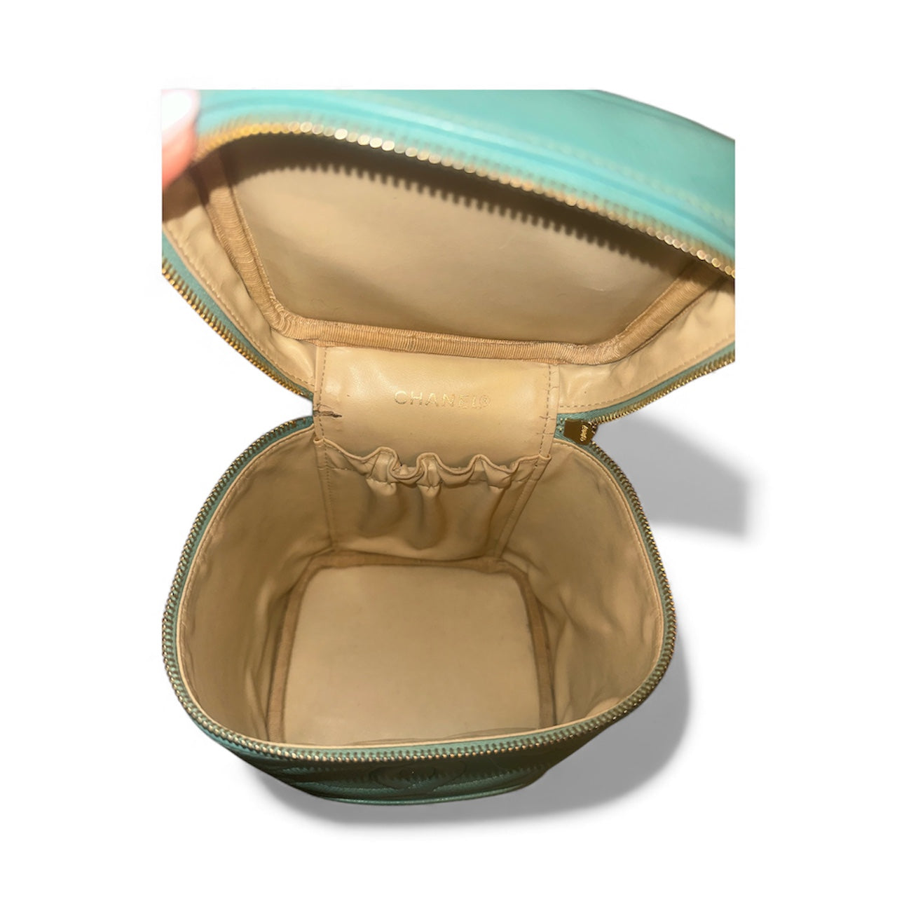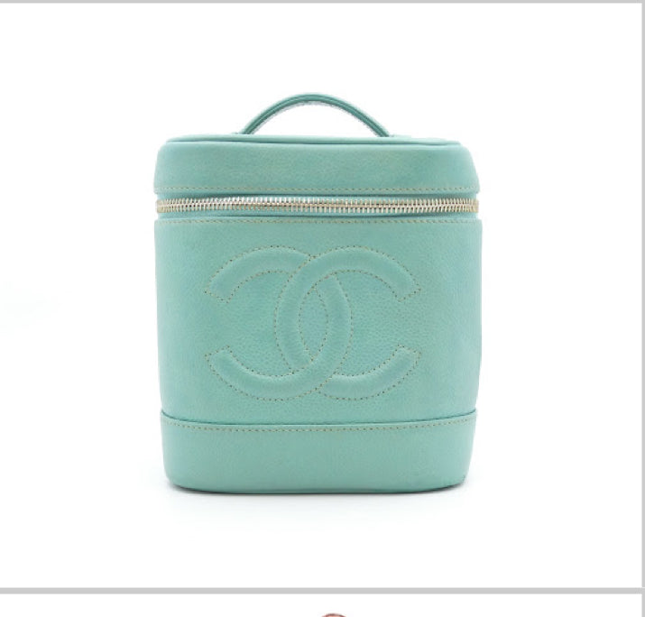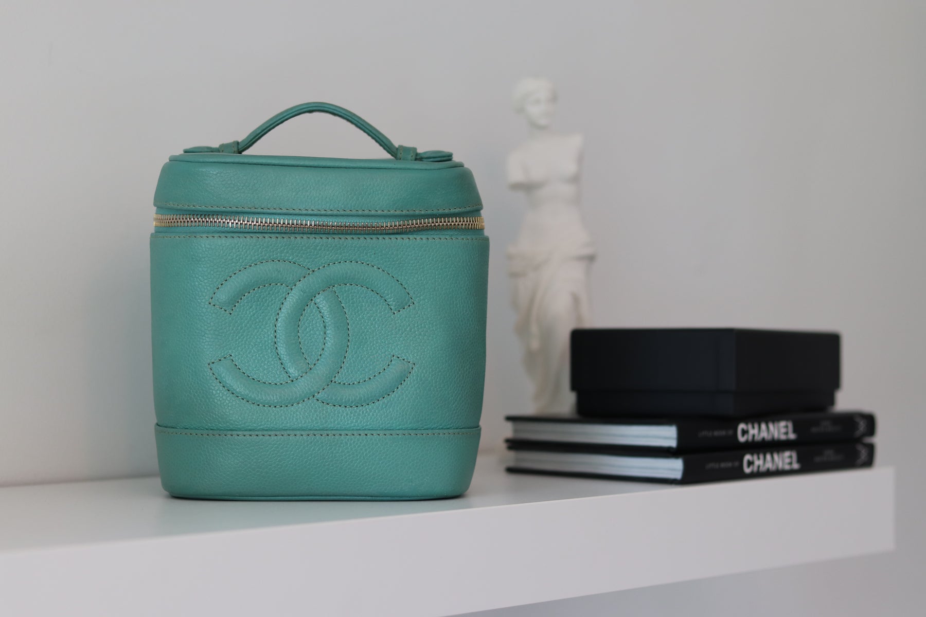 A rare vintage Chanel piece, this Timeless Vanity Case is crafted in luxurious teal blue-green caviar leather and dates to circa 1998. Made in France, it features the iconic stitched interlocking CC logo, showcasing Chanel’s enduring craftsmanship.