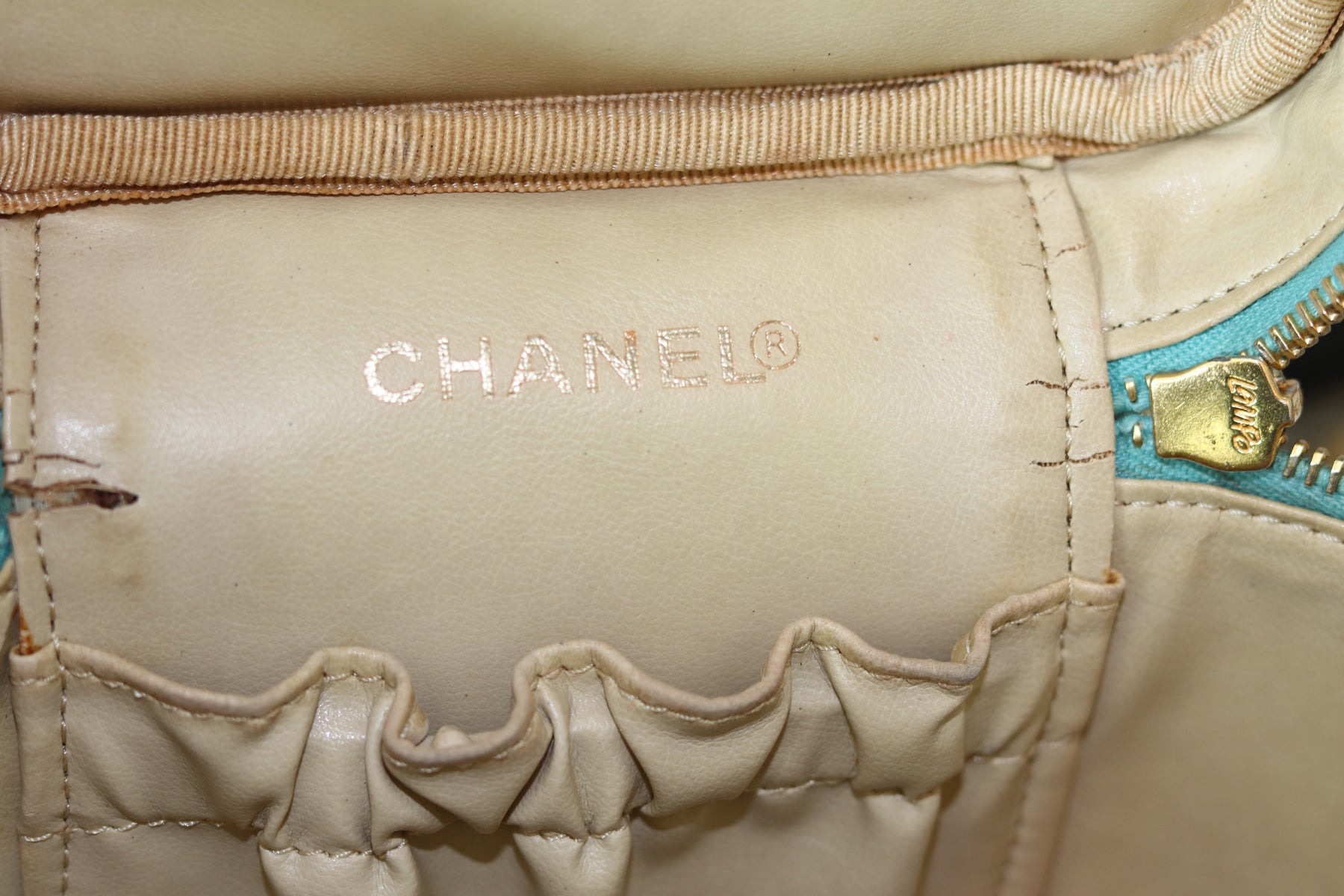 This vanity case comes with its original Chanel authenticity card and is in good vintage condition, showing light signs of wear consistent with age.