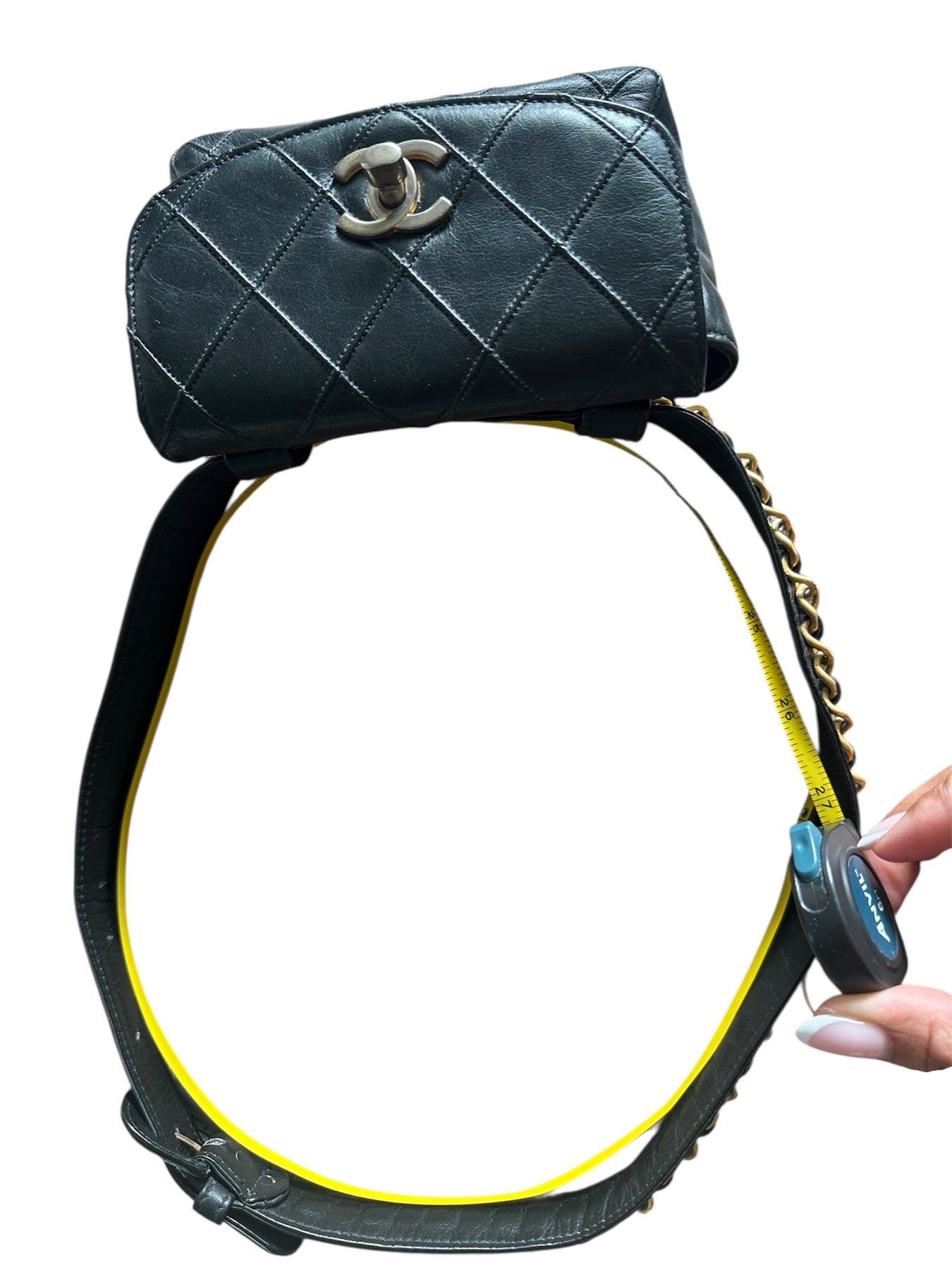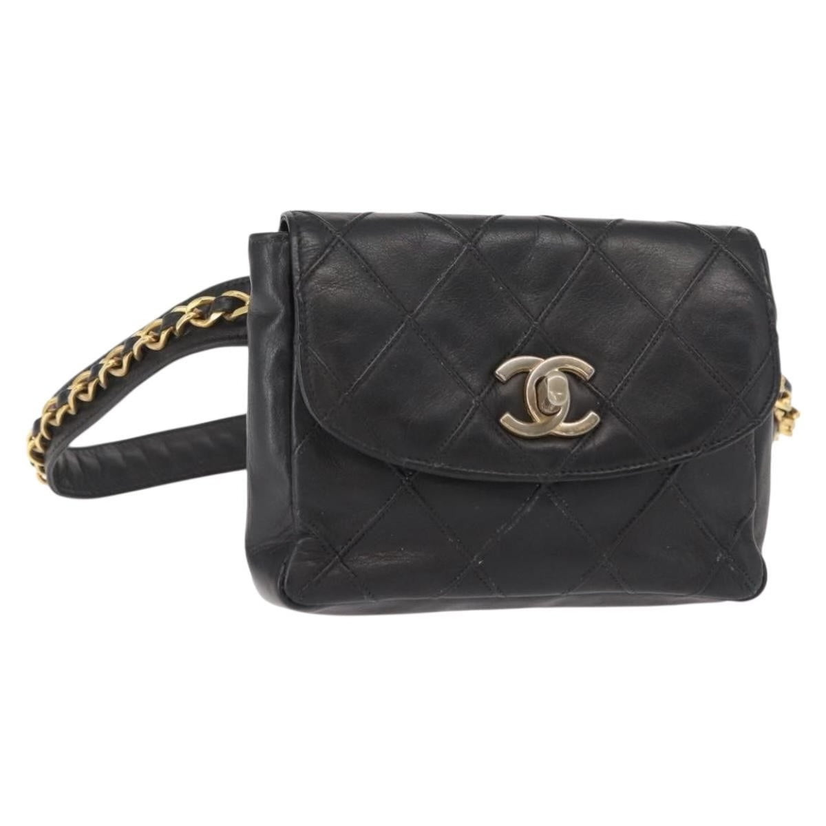A timeless Chanel moment. This authentic Chanel quilted calfskin waist belt bag in classic black features diamond stitching, a gold CC turn-lock, and a chic chain-accented belt. Effortlessly elegant and designed to elevate every look, hands-free.